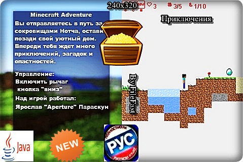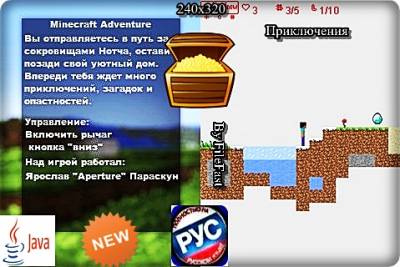 Ты выходишь из своего домика для поиска сокровищ Нотча, убивая по дороге монстров, разгадывая головоломки. Всего в java-игре 8-ь увлекательных уровней. Чтобы пройти в тебе необходимо не только собрать все алмазы, но и остаться в живых. Год выпуска/Year of issue: 2012 Жанр/Genre: Приключения Категория/Category: Java игры/Java games Размер экрана/Screen size: 240x320 Разработчик/Developer: Aperture Платформа/Platform: Java Формат файла/File format: .jar Вид устройства/Appearance of the device: для телефонов/for phones Язык интерфейса/Interface language: русский (RU) английский (ENG) Размер/Size: 1,46 Mb Статус игры/The status of the game: бесплатная/free Подготовил/Prepared by: FileFast